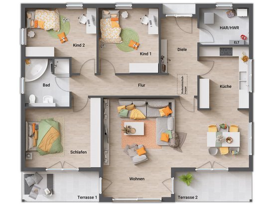 - zwei Kinderzimmer und Gästezimmer oder drei Kinderzimmer